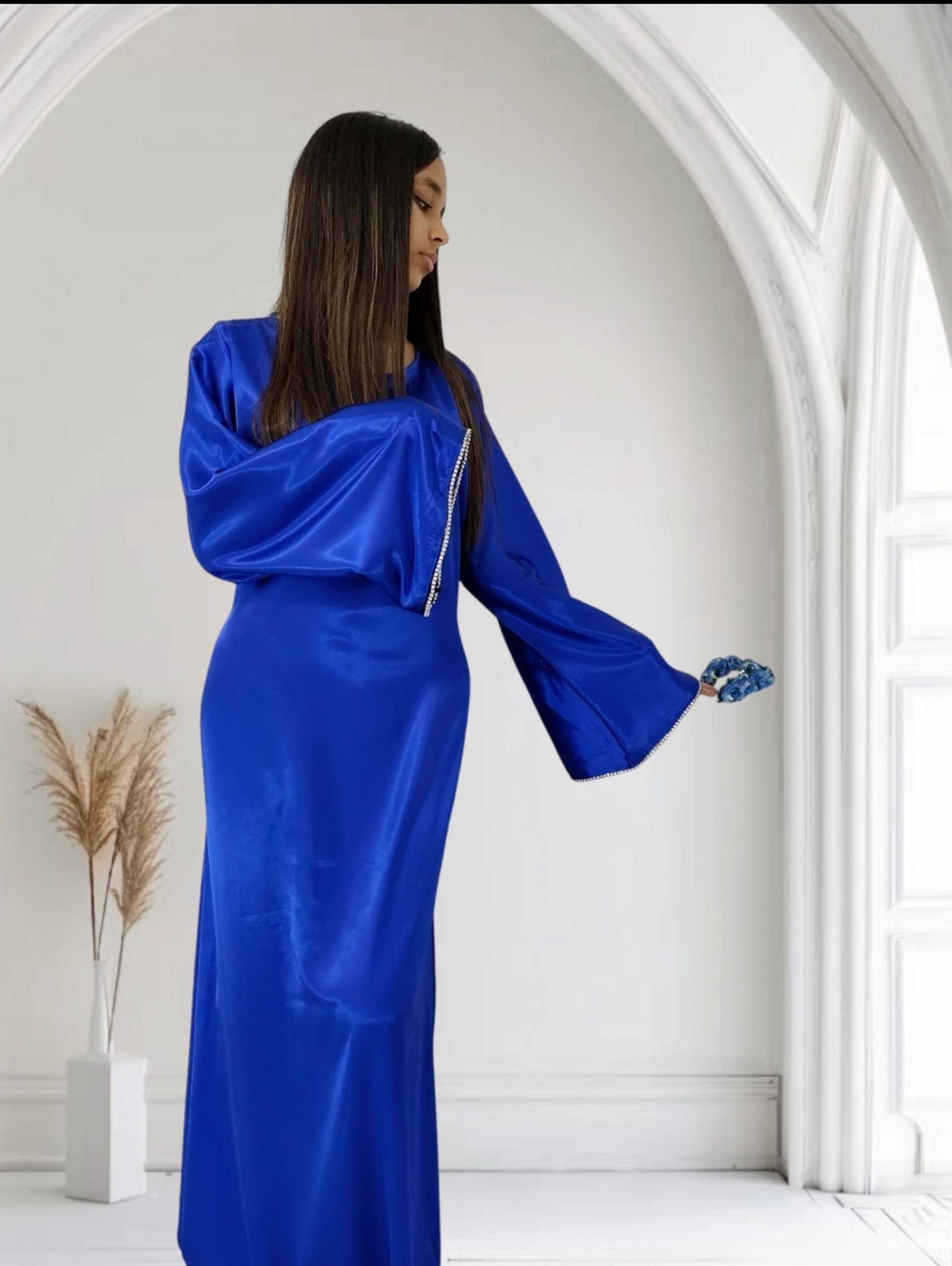Sublime robe bleue ornée de strass scintillants sur les manches longues, parfaite pour vos soirées et fêtes. Son dos lacé apporte une touche élégante et raffinée, mettant en valeur votre silhouette. Conçue pour briller lors de toutes les occasions spéciales, cette robe allie glamour et confort. N’hésitez pas à la porter pour un événement chic ou une fête mémorable.
